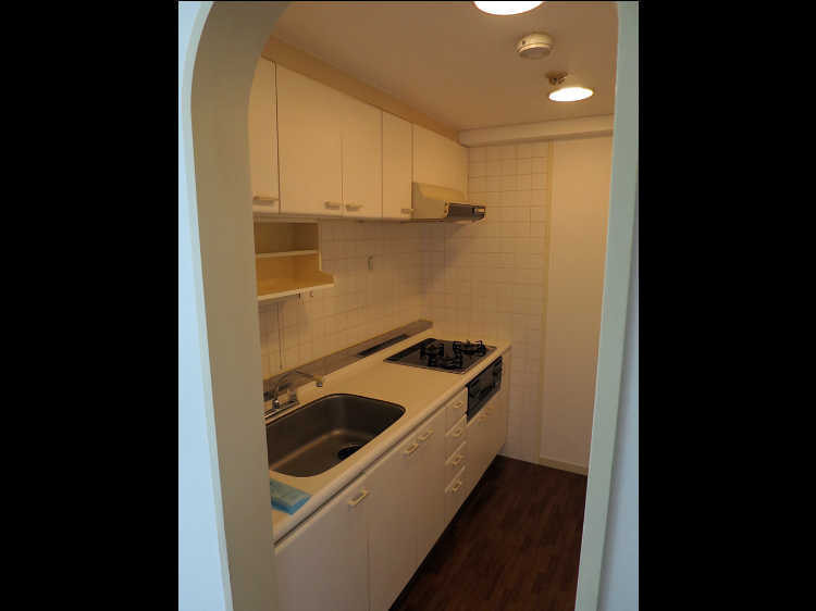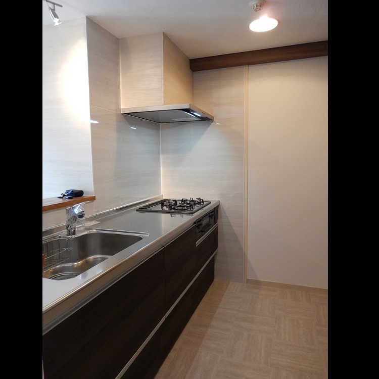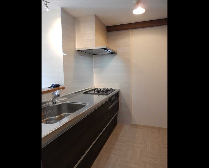 シンプルですが広くて使いやすいシステムキッチンに交換。このクラスならとてもリーズナブルに交換可能です。開口部分もできてスッキリです。