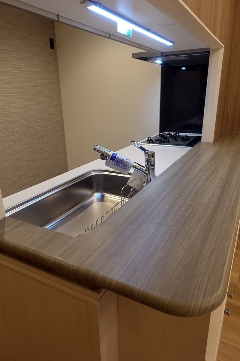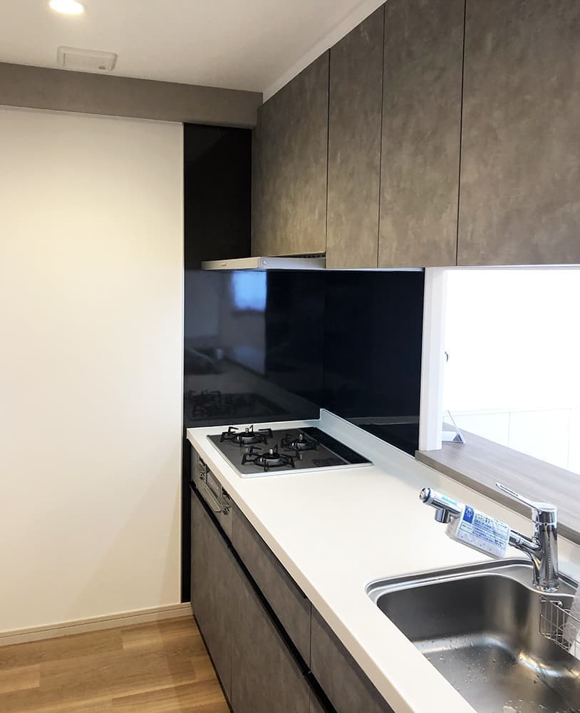 キッチンは吊り戸棚も含めてそっくり交換です。あ、でもキッチンパネルだけは前のままです。 グレーの扉カラーと黒のコントラストがシックです。