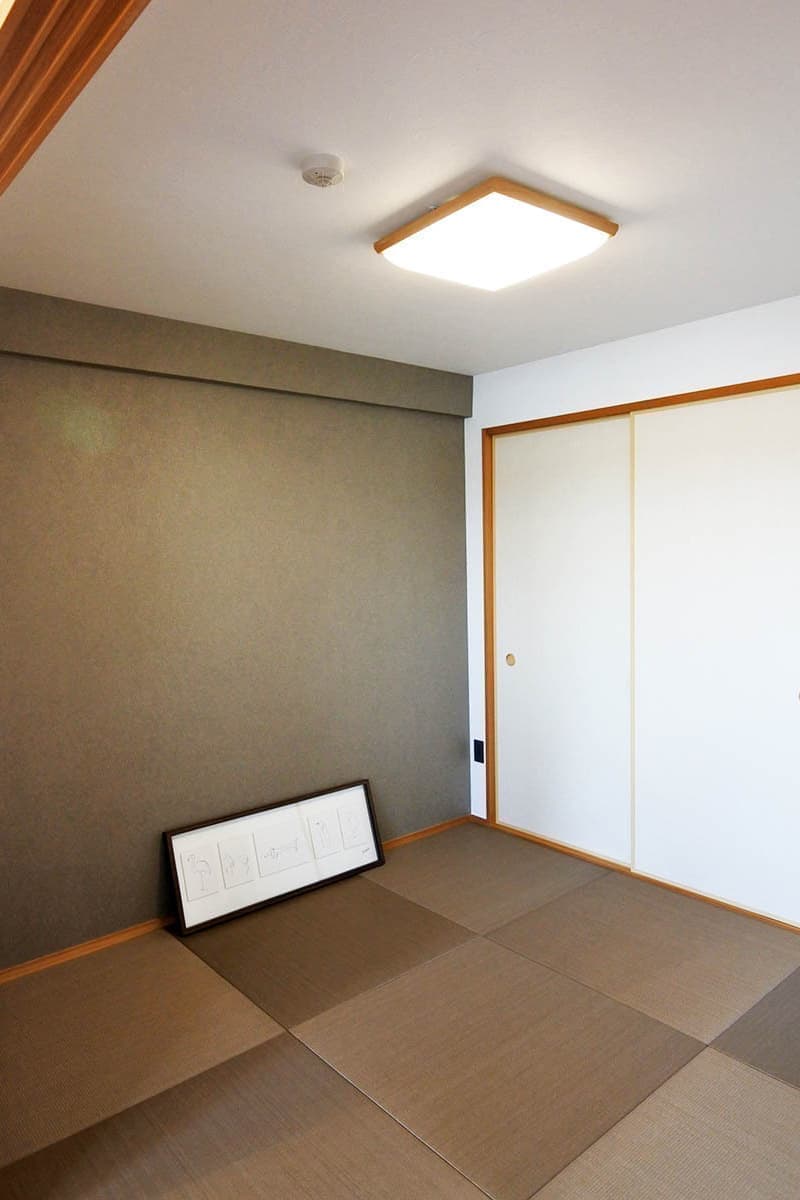 古い畳を縁のない正方形の新素材畳に入れ替えました。モカブラウンのカラーはいろんな用途にもきっと合うはずです。クロスも落ち着いた光沢パターンの混じったグレイッシュトーンです。こんな和室ならアリかも!と思えます。