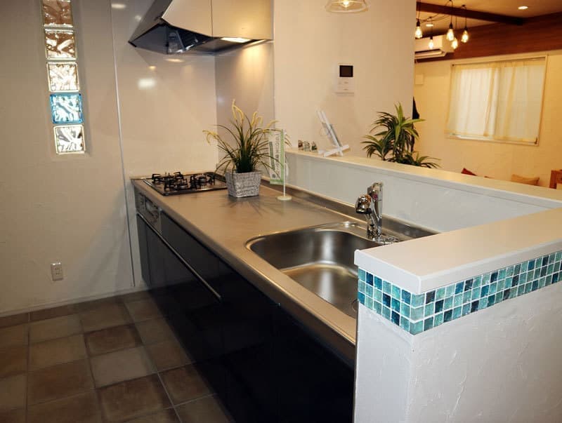 閉塞感のあったキッチンは、ガラスブロックから光が入るようになりました。キッチン床はフレンチテイストのハードな素焼き風タイルを使用。