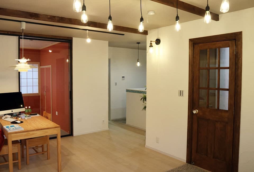 和室に繋がるブロンズガラスドアが斬新。リビングドアは木製に交換。床は既存のフローリングのままです。