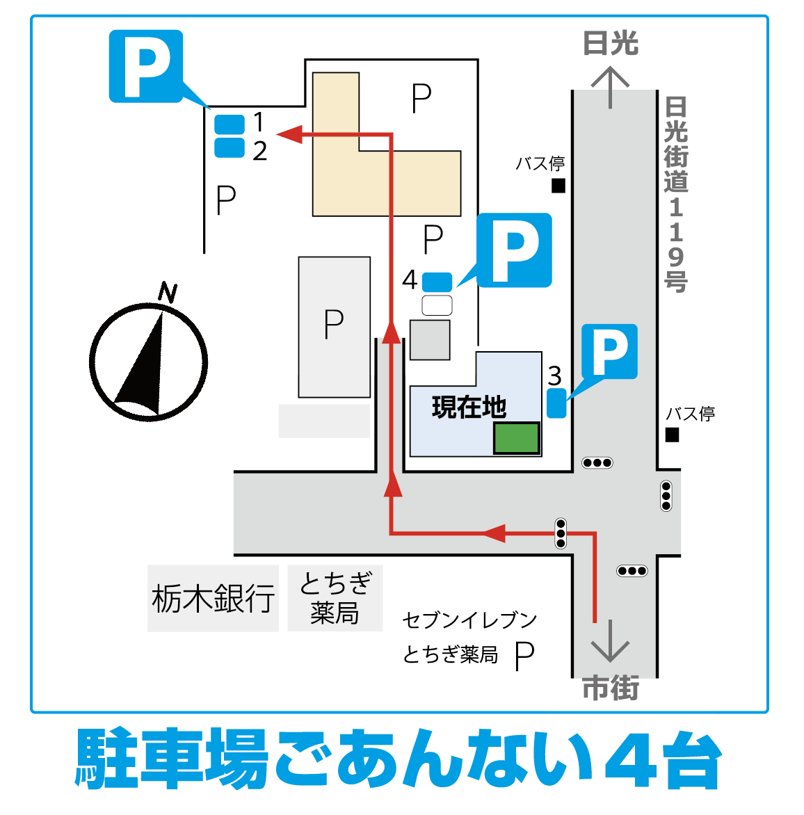 日光街道(国道119号)沿い、道路西側に面しています。
