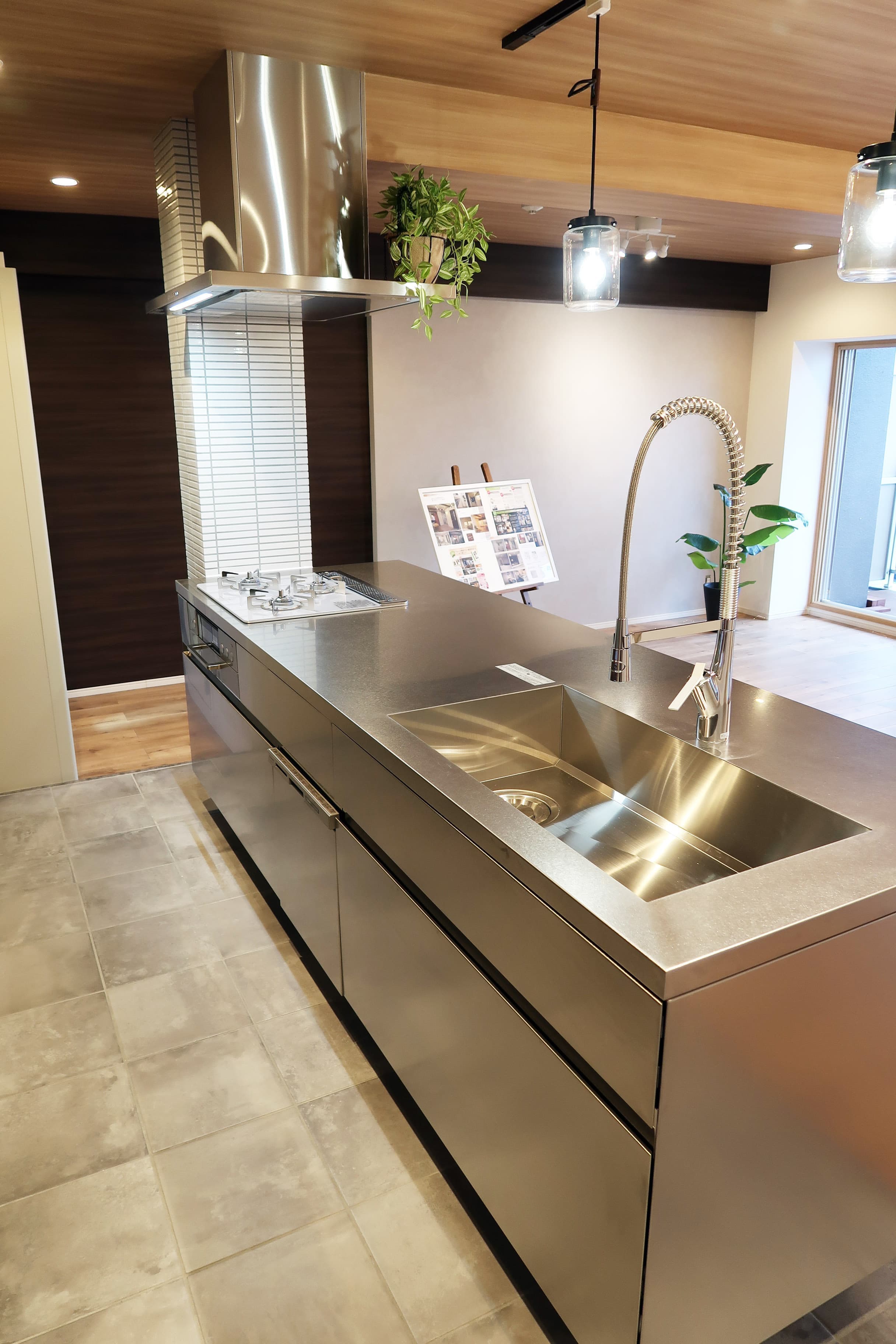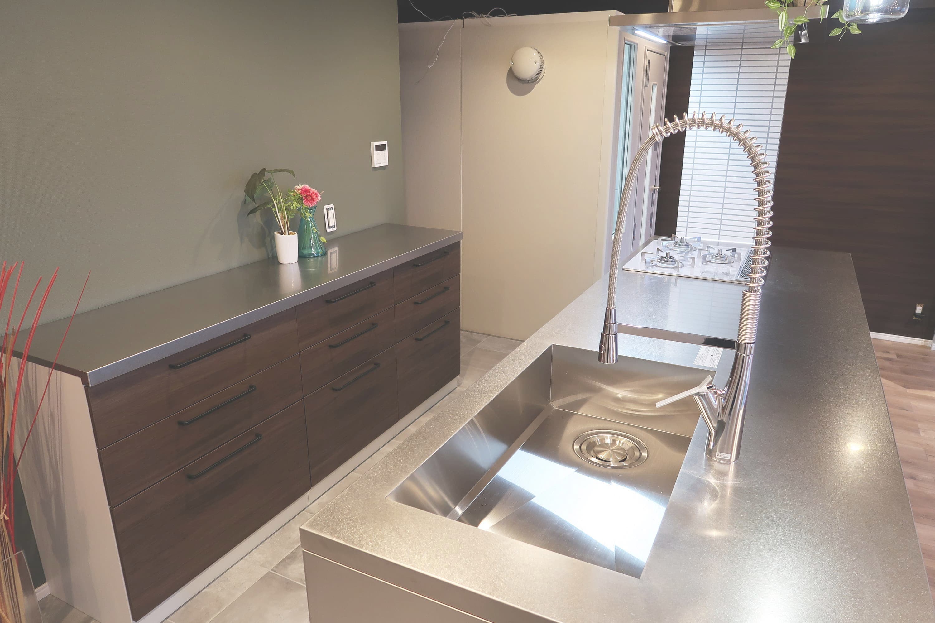 奥まったキッチンをリビングの真ん中に持ってきました。魅せるキッチンです。キッチン周りをキレイにキープするのは大変そうだけどがんばってみたいステキさです。これからの生活での楽しい会話が聞こえてきそうですね。