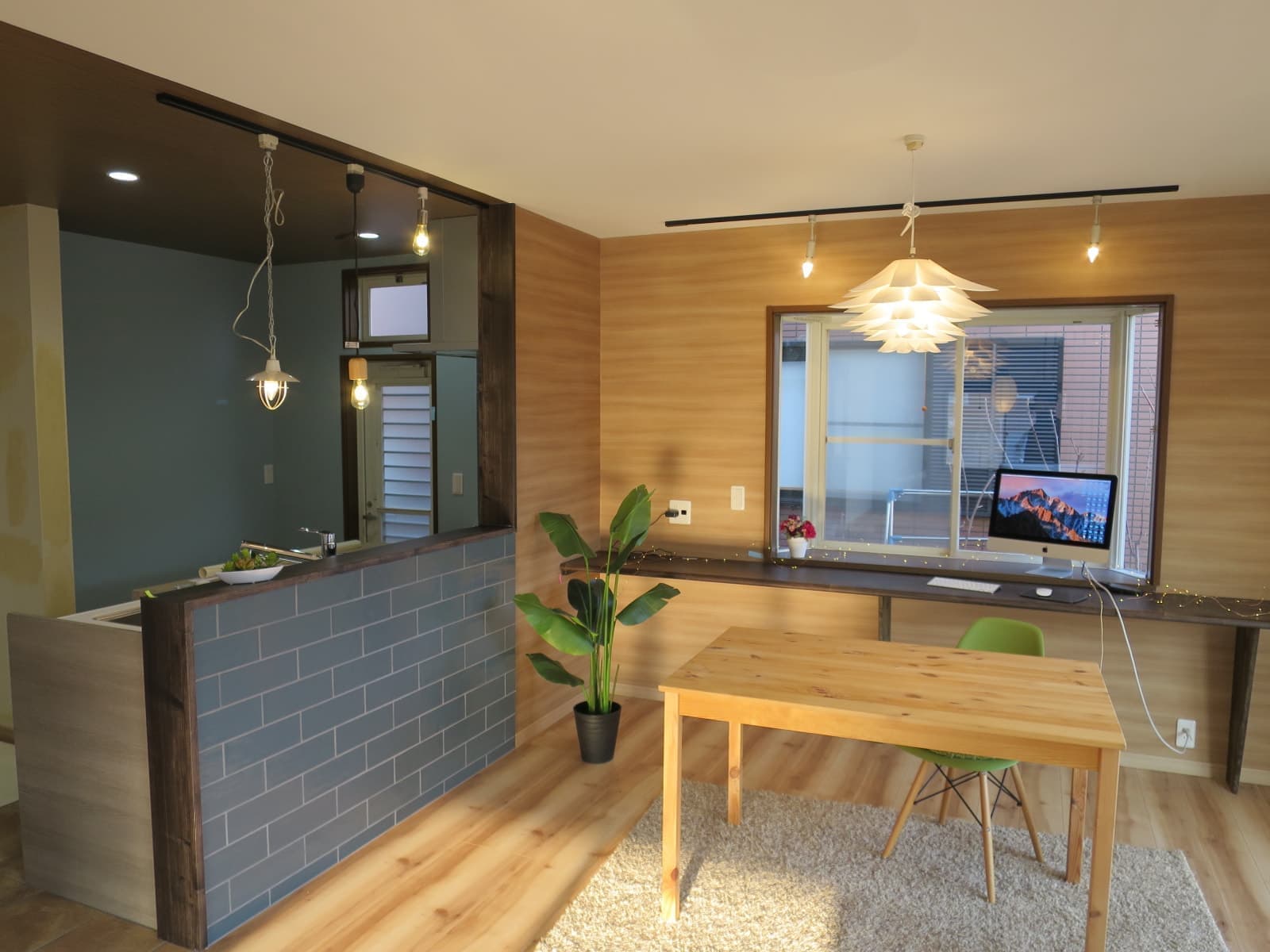 内装のテイストはナチュラルなウッディスタイル。大きなスタディカウンターもあります。ダウンライトやライティングダクトレールもあって照明で印象も大きく変わりました。