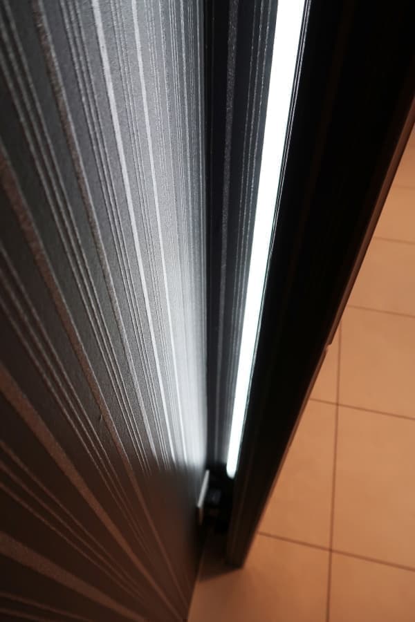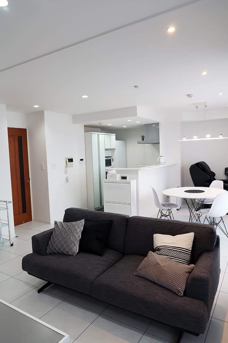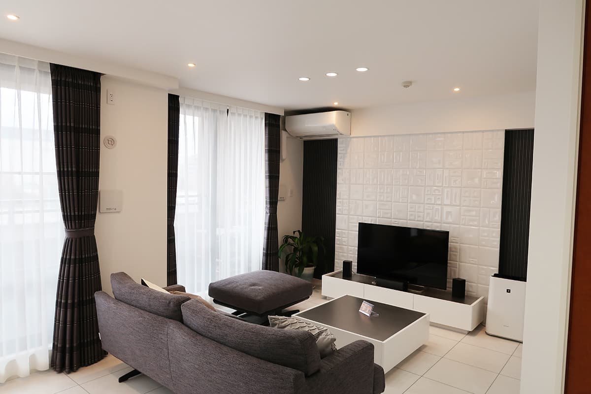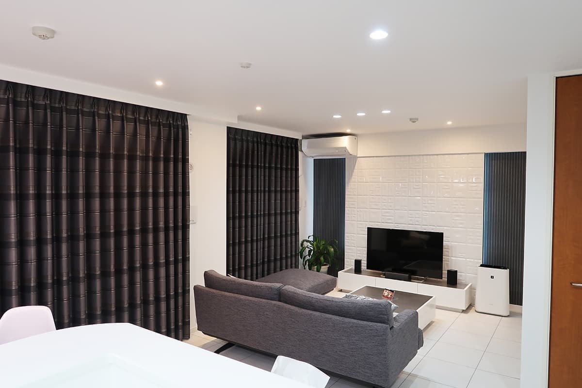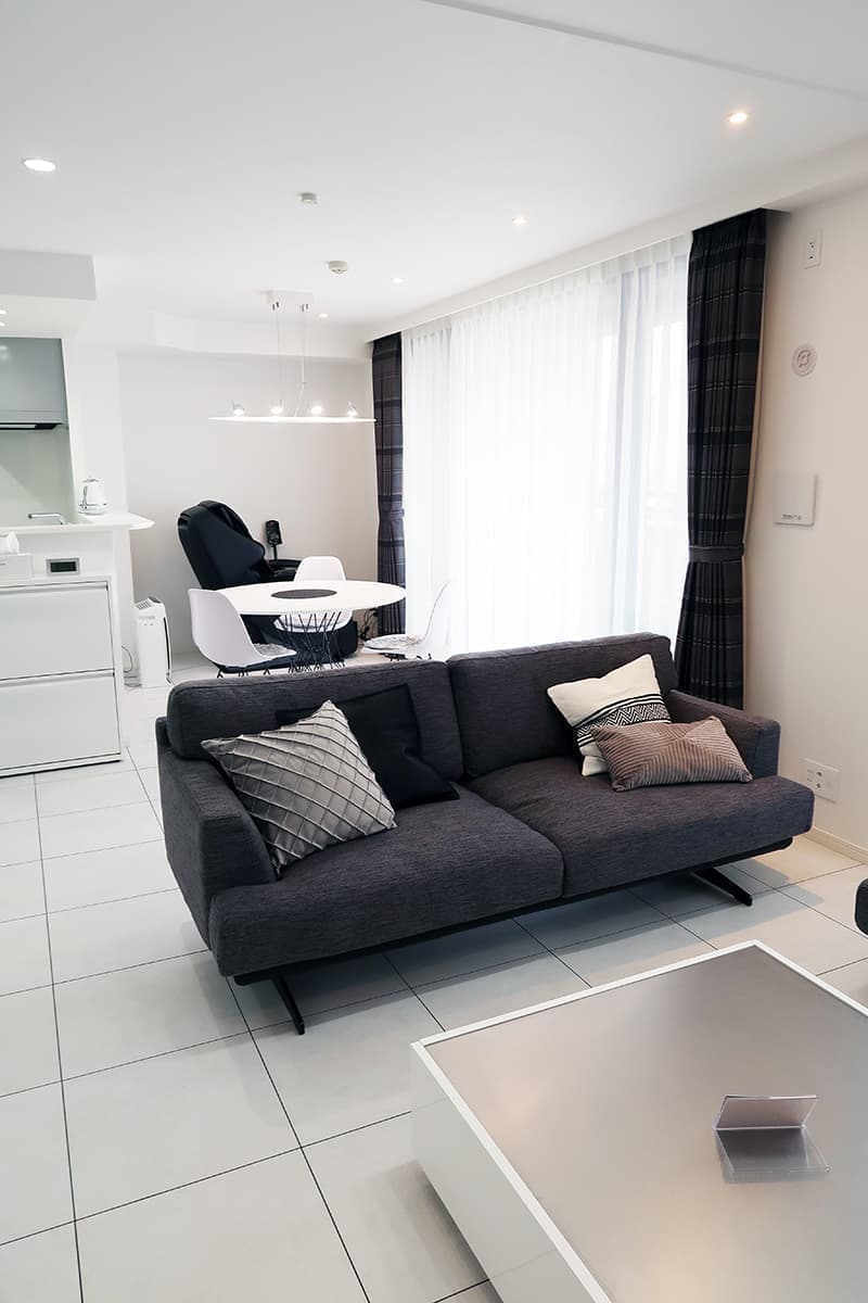 床の仕上げは白い目地ありの塩ビタイルですがグリッドがはっきりしてとてもスタイリッシュです。天井高のカーテンボックスから下がったカーテンは天井が高く見えます。