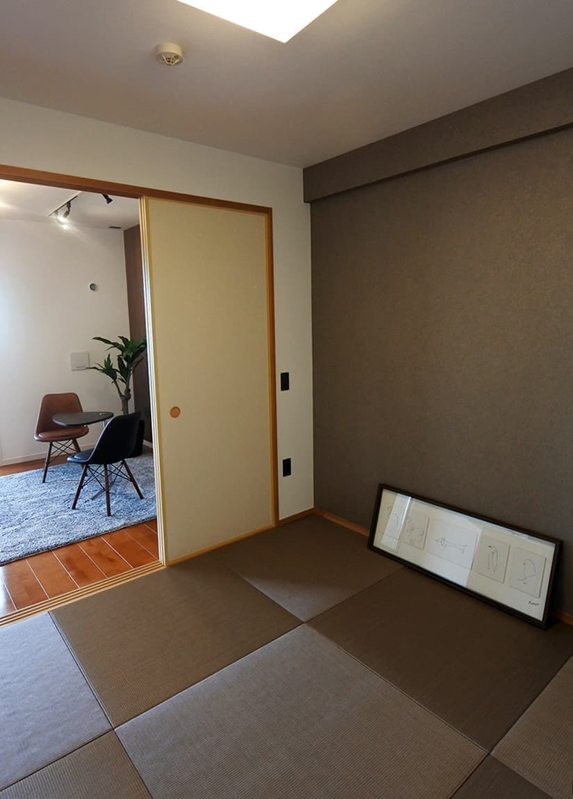古い畳を縁のない正方形の新素材畳に入れ替えました。モカブラウンのカラーはいろんな用途にもきっと合うはずです。クロスも落ち着いた光沢パターンの混じったグレイッシュトーンです。こんな和室ならアリかも!と思えます。